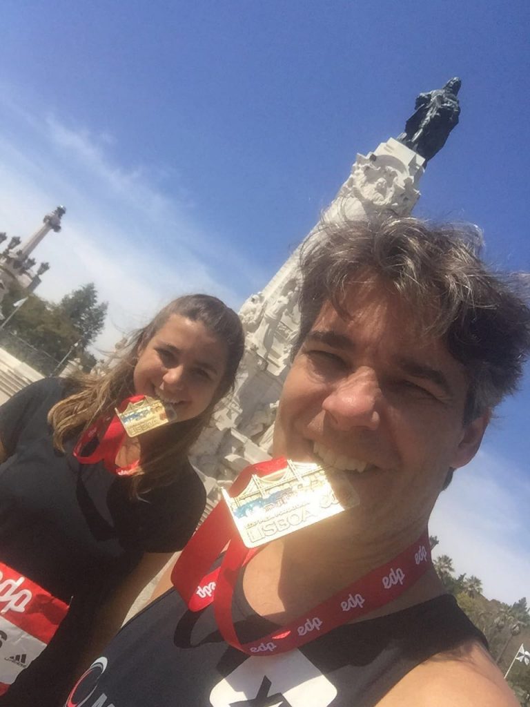 Para mim, um presente, um milagre, uma emoção ! Para Maria Clara, a sensação foi de superação. Ela se achou que foi rápida demais, pois, nos treinos longos que fizemos, era demasiadamente chato permanecer correndo depois de 1h30m…. mesmo com as lindas paisagens do Rio…. Mas Lisboa tem o lindo Mosteiro dos Jerônimos ao fundo.